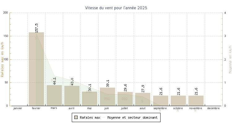 | fevrier | 1.1 °C | 6.4 °C | 23.2 °C | 17.7 °C | 11.5 °C | 3.1 km/h | 157.5 km/h | S |